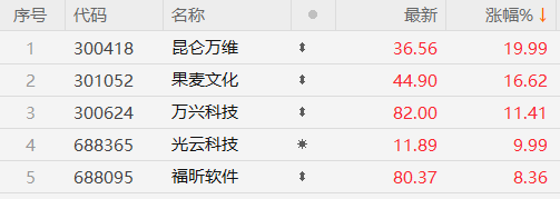 当日收盘,昆仑万维(300418.SZ)20CM涨停,果麦文化(301052.SZ)大涨16.62%;万兴科技(300624.SZ)涨超11%,光云科技(688365.SH)、福昕软件(688095.SH)等跟涨。