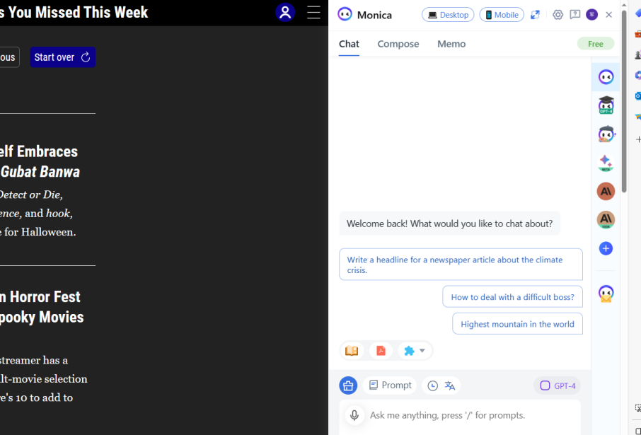 一个接入了ChatGPT的API接口的网页侧边栏插件,启动该插件后,在浏览任何网站时,Monica就能使用ChatGPT的能力,解读任何信息或文本,或对网页内容进行探讨,以及提供翻译等。