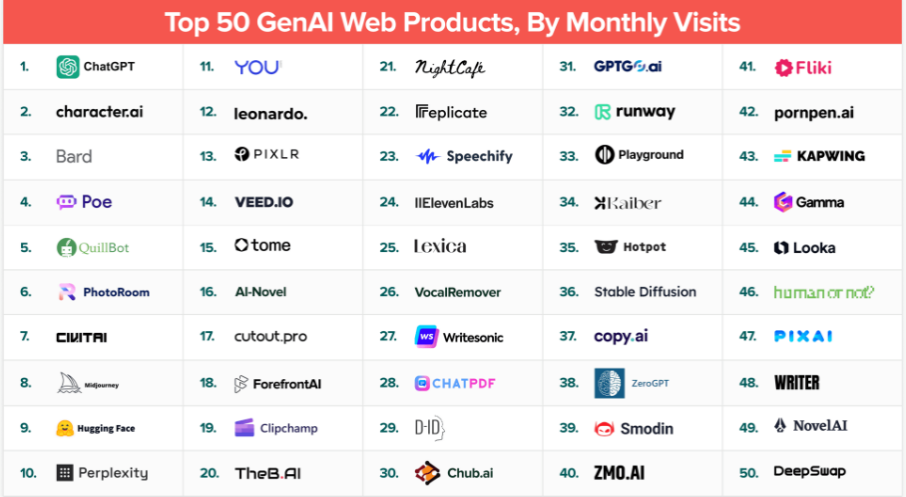 著名投资机构A16Z上月公布的流量前50的AI网站,其中相当一部分是“套壳”应用