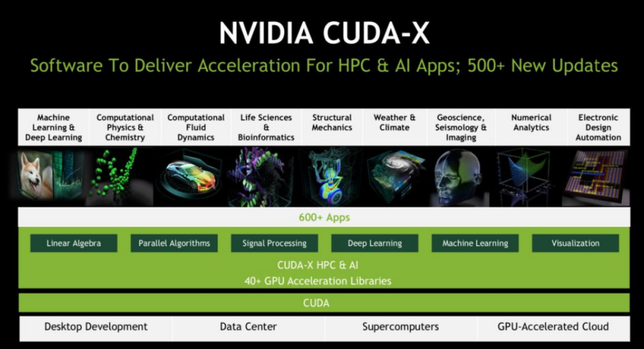 经过持续的演进,CUDA已然形成了一个丰富而成熟的庞大生态。英伟达也由此实现了软硬件深度捆绑:用他的软件就必须买他的硬件,买他的硬件使用CUDA可事半功倍。