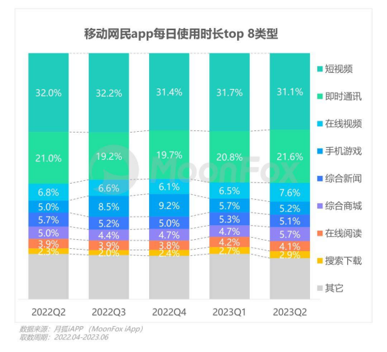 根据月狐iAPP统计的数据,从2022年Q2到今年6月,在移动互联网的所有类别的APP中,短视频的使用时长占比均高达30%以上,为所有类别中最高。