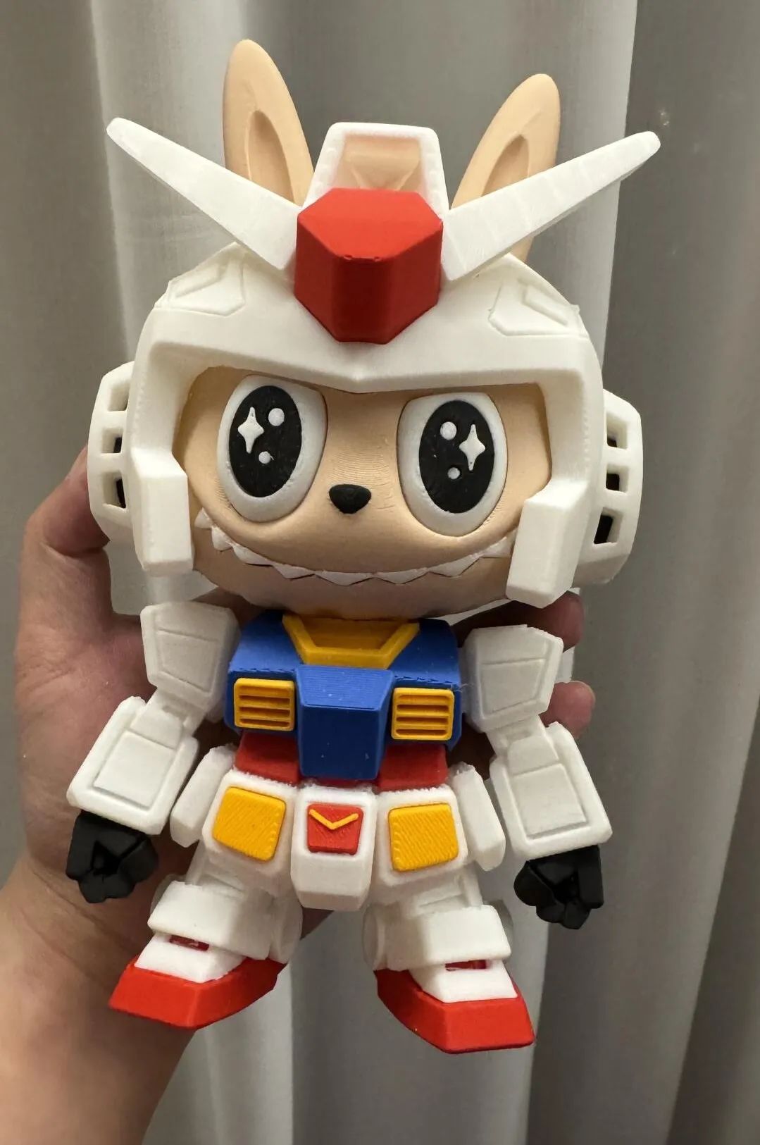 但也有人入坑打印圈之后,越走越远,不断给自己上难度,比如啵妞。在她的社交媒体动态里,她打印的3D版labubu,在原版基础上完成高度还原以外,还和她喜欢的日本IP高达进行了结合,制造出了足够独特的3D版labubu。