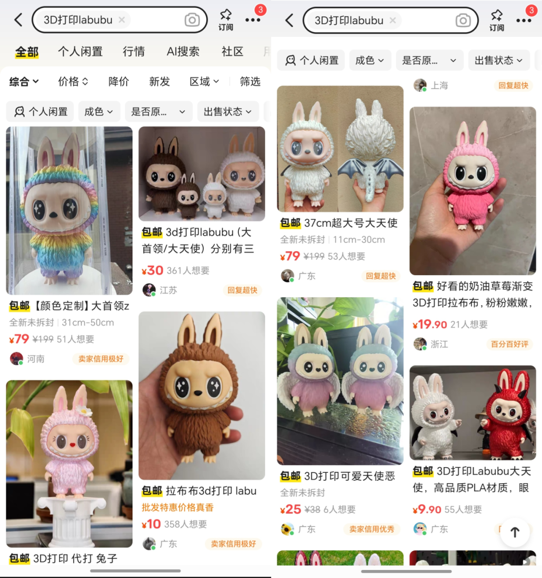 官方渠道收货周期长,黄牛渠道溢价收又不值,这让不少心急的labubu爱好者们瞄向了3D打印,来作为平替。