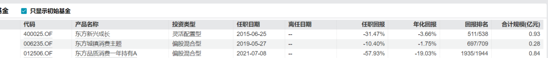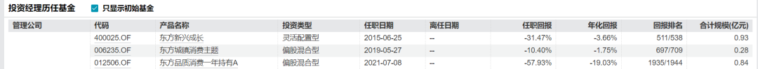 其中,东方品质消费于2021年7月开始接管至今,任期回报为-57.93%;东方城镇消费主体2019年至今回报为-10.4%;东方新兴成长混合2015年6月至今长达10年时间,回报为-31.47%。管理的产品跌幅最高的东方品质消费A和C,截至目前净值竟然只有0.42元、0.41元。