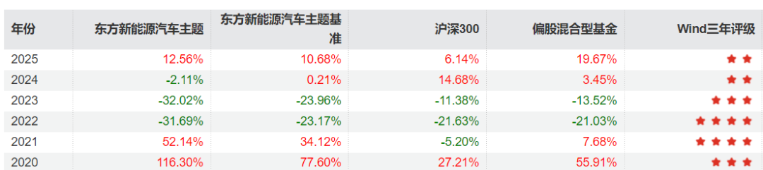 东方新能源汽车主题混合是李瑞的代表产品,2017年12月开始管理该只产品,任职总回报高达58.08%,超越基准回报5.56%。该产品业绩表现也跟随市场震荡而波动,其中2020年是该产品收益率表现最好的一年,达116.3%,2021年虽然有所回落,但收益率超过50%,且高于偏股混合型基金收益率近8倍。2022年-2024年业绩不佳,分别为-31.69%、-32.02%、-2.11%。2025年实现12.56%的正收益。