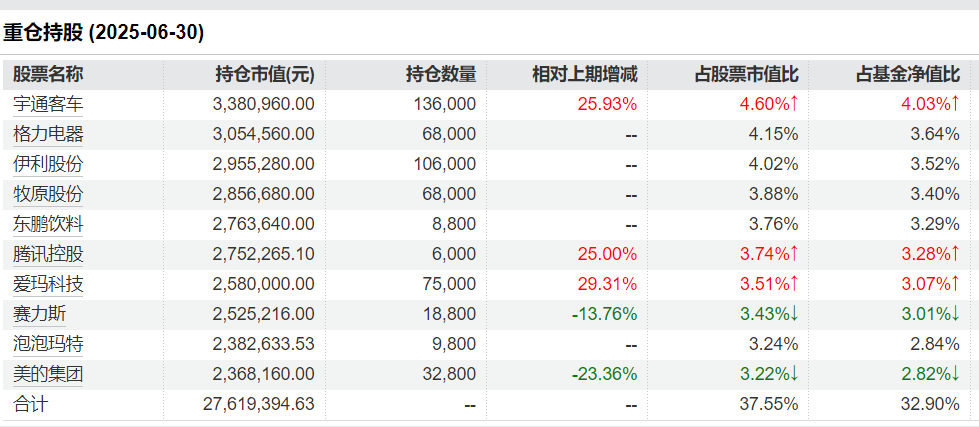 查看东方品质消费二季度报告,前十大重仓股以消费类上市公司为主,分别为宇通客车、格力电器、伊利股份、牧原股份、东鹏饮料、腾讯控股、爱玛科技、赛力斯、泡泡玛特、美的集团,市值占比不超过50%。