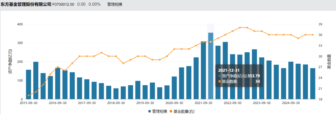 截至2025年二季度末,东方基金公募资产管理规模1234.05亿元,在近200家公募机构中排名第54位。不过这一规模较2024年二季度末下降6.44%。