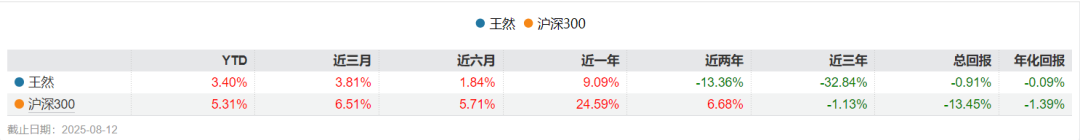 截至目前,王然管理基金规模2.05亿元,在管基金最佳任期回报为-10.41%。wind数据显示,截至8月12日,王然管理的3只产品近1年、近2年、近3年回报分别为9.09%、-13.36%、-32.84%,均跑输沪深300表现。