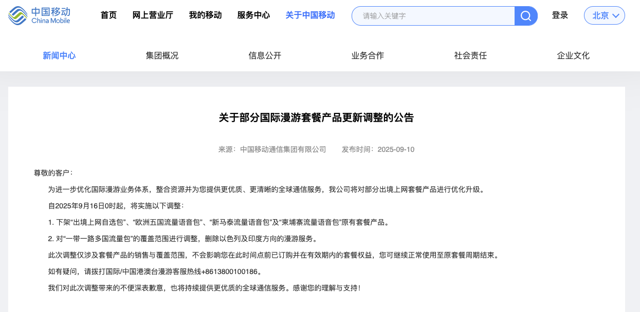 9月10日,中国移动发布公告,将对部分出境上网套餐产品进行优化升级。自2025年9月16日0时起,将实施以下调整:1.下架“出境上网自选包”、“欧洲五国流量语音包”、“新马泰流量语音包”及“柬埔寨流量语音包”原有套餐产品。2.对“一带一路多国流量包”的覆盖范围进行调整,删除以色列及印度方向的漫游服务。此次调整仅涉及套餐产品的销售与覆盖范围,不会影响客户在此时间点前已订购并在有效期内的套餐权益,客户可继续正常使用至原套餐周期结束。