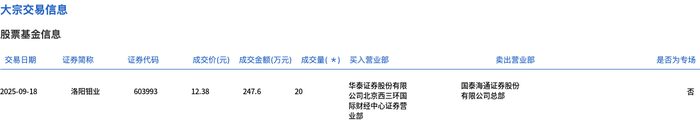 洛阳钼业今日大宗交易平价成交20万股,成交额247.6万元