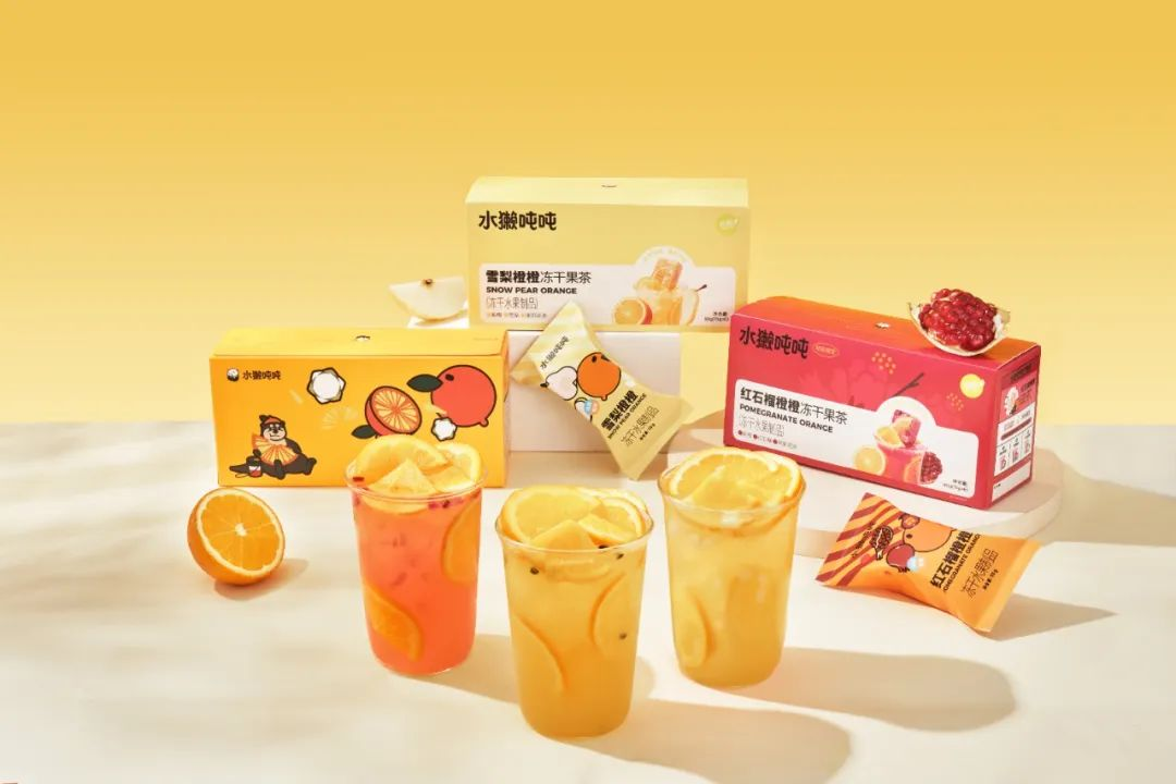 同类“饮品”,还包括以水獭吨吨为代表的冻干果茶,产品采用独立塑料袋装的小包装设计,在火车上撕开,将果茶块扔进水中,几秒钟后一杯“现制”果茶就做好了。
