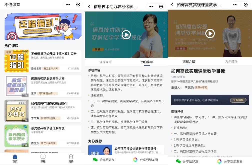 去年3月字节跳动以小程序为载体推出“不倦课堂”时,笔者曾短暂体验过该产品,时至今日它也未做出多大改变。就体验而言,不倦课堂内有大量面向教师的课程,包括名师讲堂、特色课程、政策讲解等。其中较多的品类是线下教师转线上教学的课程,例如线上教学班级管理、微课制作与开发、直播课堂细节、甚至包含了最基本的电脑操作、软件培训等。同时,不倦课堂还设有微信社群入口,便于教师同僚们相互交流。
