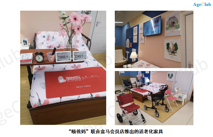 2021年,“颐爸妈”曾与盒马会员店合作,将线上产品业务转移到线下的实体门店,联合福乐慈、松永、卫美恒、安寿、英洛华等品牌,在盒马门店的养老用品专区,上架护理床、坐便器、洗澡椅等适老化家具。