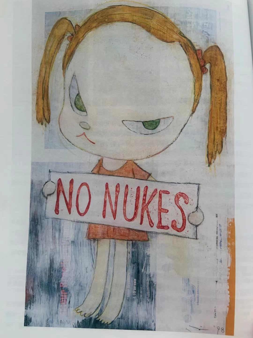 反战之外,反核也是奈良美智创作的重要主题。2011年日本大地震及其引发的福岛核泄漏是他创作的拐点,核泄漏事故地点离奈良的工作室仅70公里。灾难过后,他一度陷入创作瓶颈,质疑“灾难过后,谁还需要艺术?”。而他的画作在后继政治行动中产生了影响——举着“No Nukes”的小女孩图像,地震后频繁地出现在日本各地的反核游行中。奈良美智对此感到很高兴,认为比起高挂在美术馆,让作品在游行队伍中出现更有意义得多。