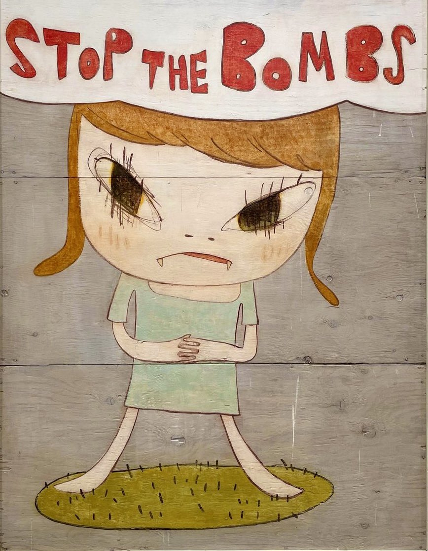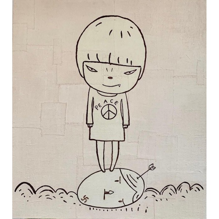 奈良美智常在社交网络Twitter同粉丝互动。日前,他贴出了反战小女孩的画作,女孩生气地光脚站在草地上,背景板上写着大大的 “STOP THE BOMBS”,这幅画的灵感来自约翰·列侬和小野洋子在1968年的《不扩散核武器条约》,表达了奈良美智支持和平的主张。