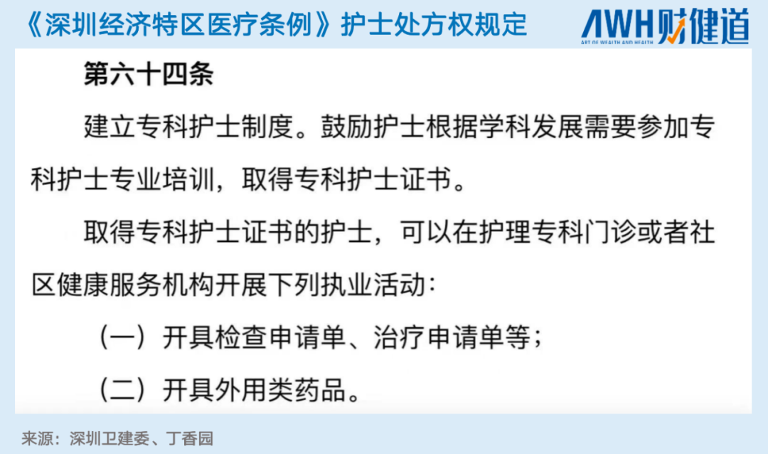 在修订版的《深圳经济特区医疗条例》(下称“医疗条例”)第六十四条明确写道,具备专科护士证书的护士,可以在护理专科门诊或者社区健康服务机构开具检查申请单、治疗申请单、外用类药品等执业活动。