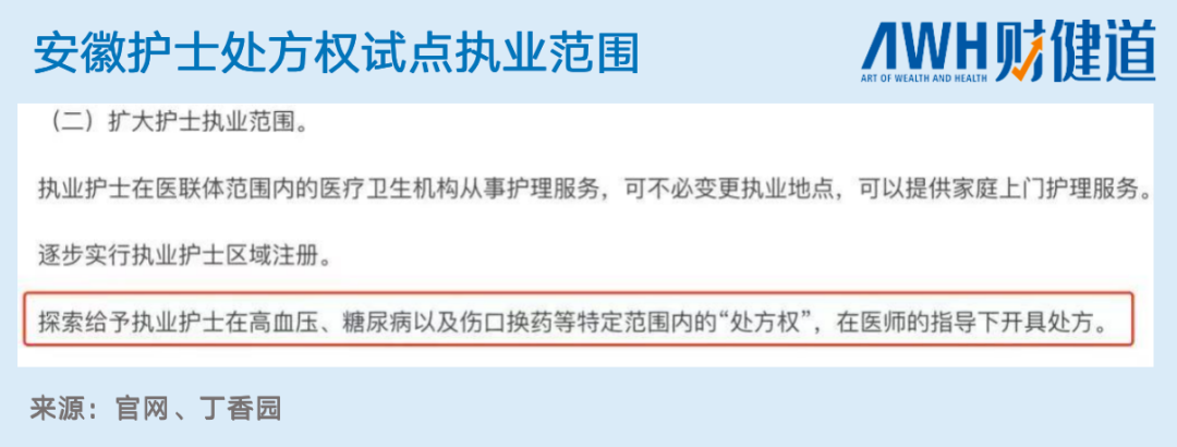 2017年,安徽省率先试点尝试赋予护士处方权。相比深圳的条例,安徽省当时护士的处方权范围更窄,考核更严苛,用一段公式表达即“严苛的考核机制+专科护理门诊=医生指导下有限的处方权”。