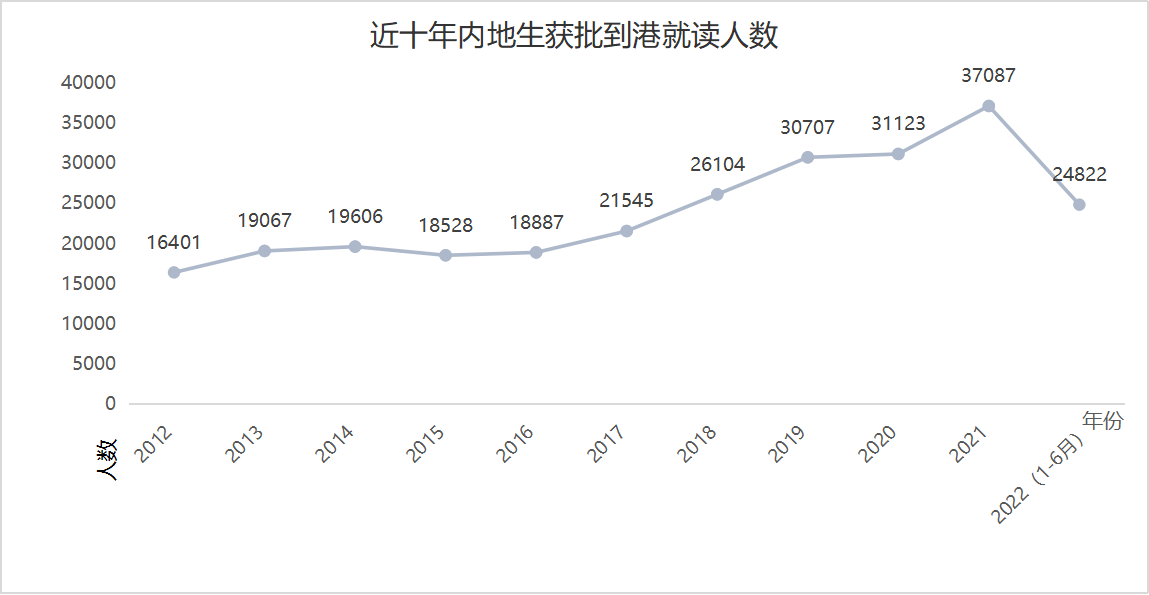 根据香港入境处数据,近五年来内地学生获批到港就读人数逐年提升。2021年,有37087名内地学生获批到港就读,同比增长19.16%,达到历史新高。