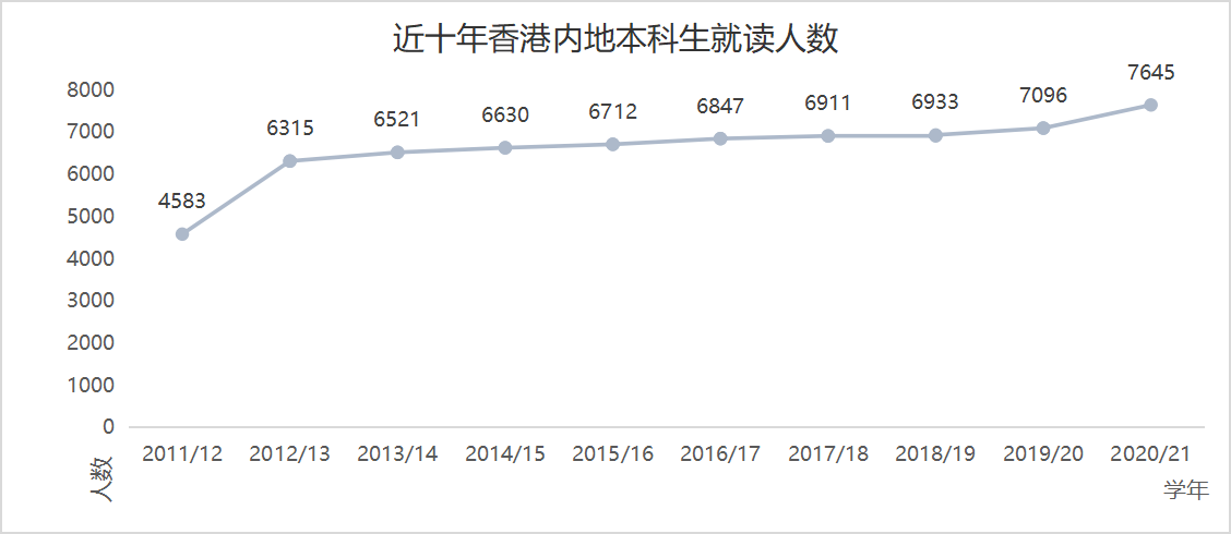 根据香港教资会数据,2020-2021学年,香港八间大学的内地本科生达到7645人,人数逐年走高。