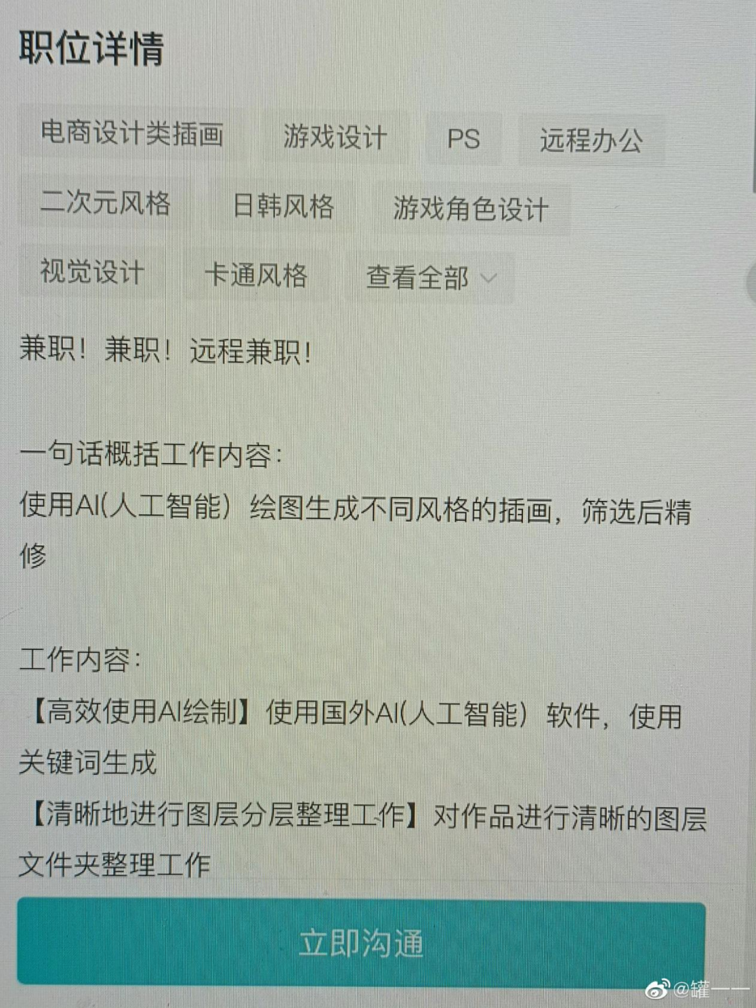 需求也得到了市场的回应,一方面,闲鱼上陆续出现了售卖AI绘画作品的帖子,主题都突出了低价快速,“1分钟内出图”,“5元4张”,不少贴子还声称是由“职业画师调教”,保证质量。另一方面,网友@罐一一发现,招聘软件上已经出现了AI绘画生成的岗位,工作内容就是AI助理,使用AI生成不同风格的插图,筛选后精修。