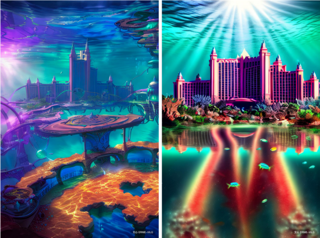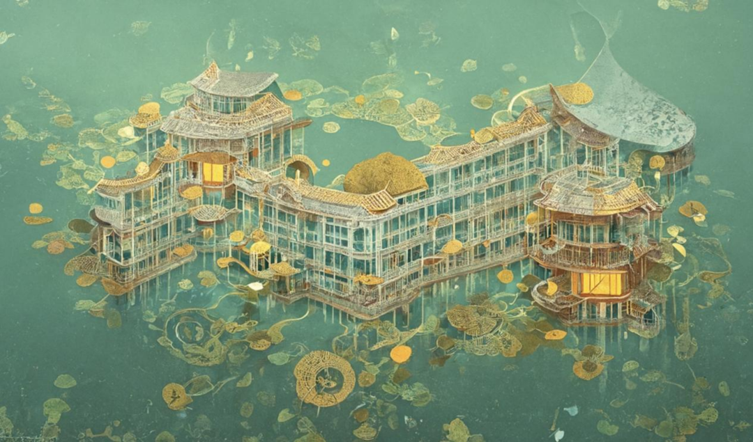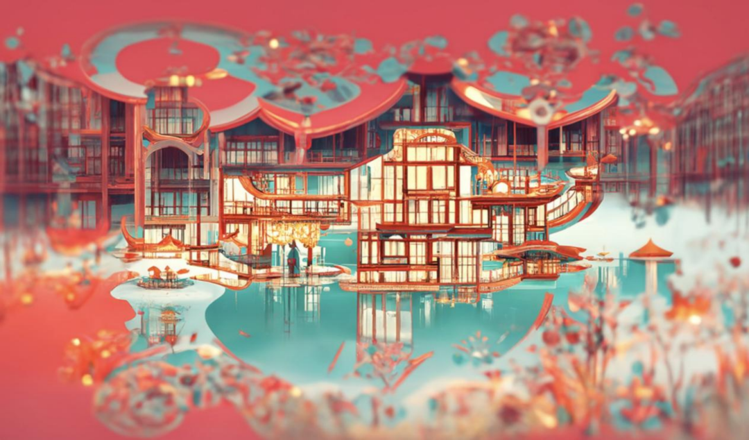 以TIAMAT为例,输入关键词“中国旅店、夏日池塘、浪漫主义、古典和赛博科技的结合、c4d渲染、maya渲染、散发金属光泽、装饰管线”后,三四分钟后,便会得到如下的效果图: