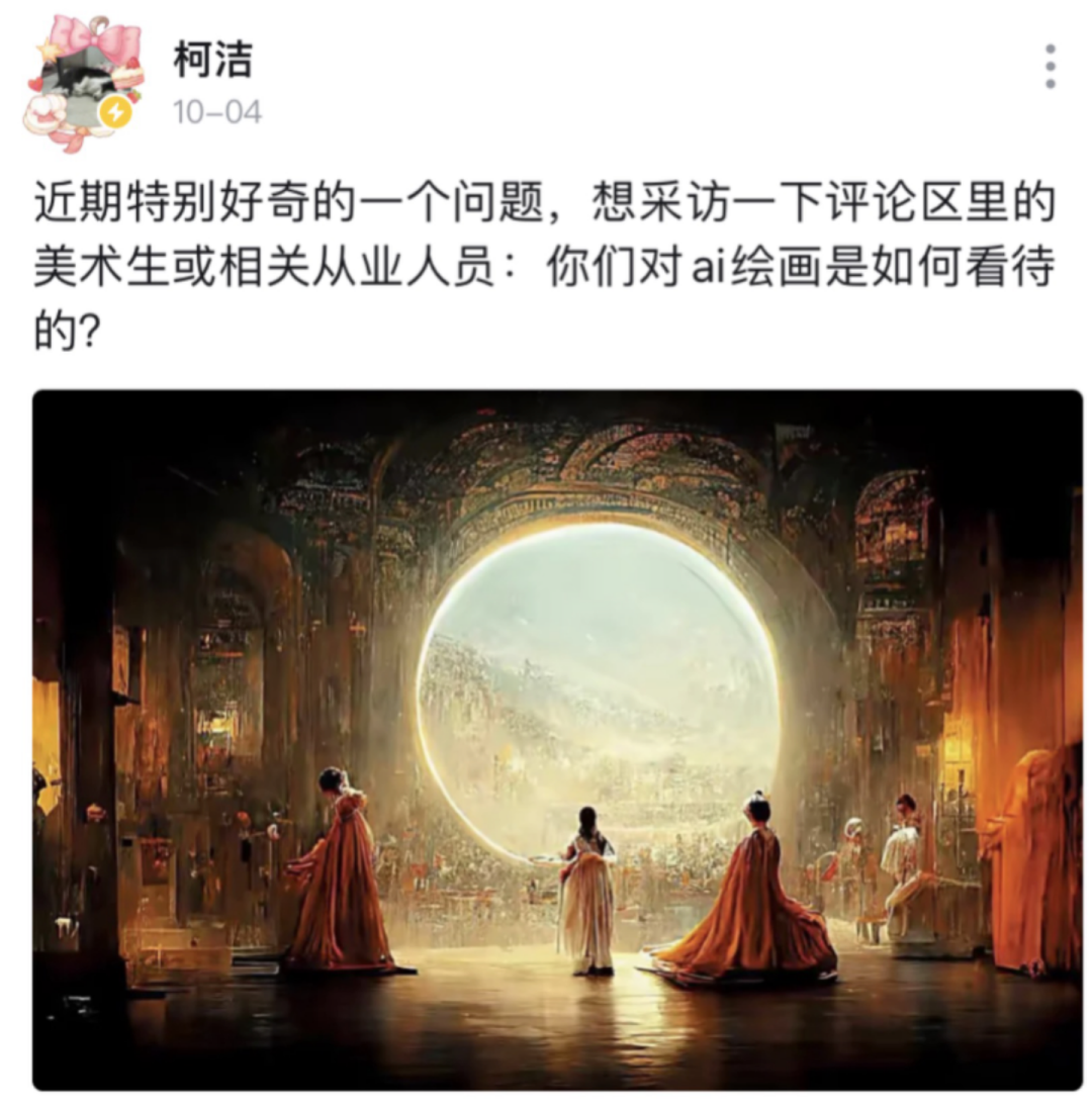 柯洁选择的配图也别有巧思,是今年在美国科罗拉多州博览会上获得数字艺术/数码摄影单元竞赛一等奖的作品《空间歌剧院》,该作品借助AI绘画工具Midjourney制作而成,却一举打败了人类设计师并最终夺魁。