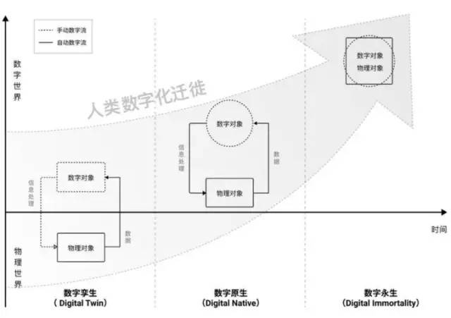 这不禁让人联想起了元宇宙的一些理念。宇宙的进化历程实际上以是人类文明数字化进程为标志的,人类向数字文明迁徙过程可以概括为三个阶段:数字孪生、数字原生和数字永生。