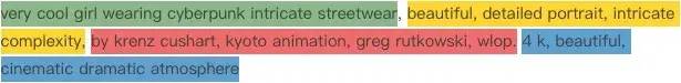 (3)优秀的描述词不仅需要创作者以简明扼要的词句组合描述清楚要绘制的内容,更需要融入必要的艺术专业修饰词,如下只有绿色部分是对主体内容的描述,即“非常酷的女孩穿着赛博朋克的、复杂的休闲服饰”;黄色部分是对人物主体的进一步修饰,以便 AI 能读懂人类希望绘制出的是一个漂亮写实的女性;红色部分是加入了一些专业艺术家和工作室的风格,让画面的美感直接进入艺术殿堂;蓝色部分是更多的细节方面的艺术修饰词