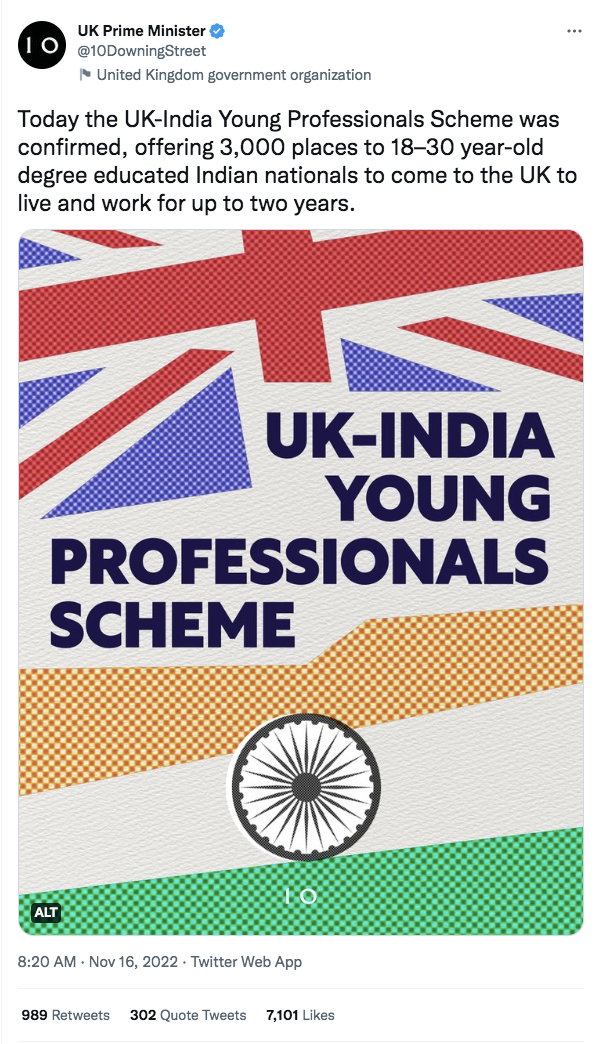 继英国首位印度裔首相里希·苏纳克上台后,11月16日,英国首相府在其官方推特上宣布正式推出“英国-印度青年专业人才计划(UK-India Young Professionals Scheme)”,向受过高等教育的18岁-30岁印度公民提供3000份签证,允许他们来英国工作和生活两年。