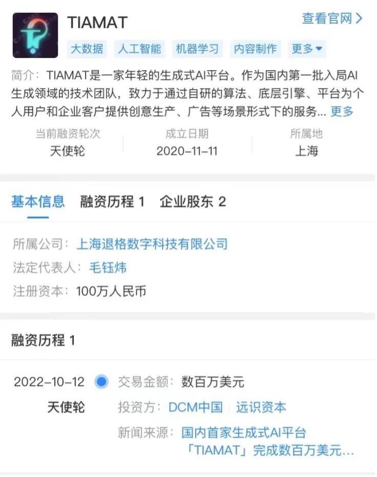 资本市场自然敏锐地嗅到了这一方向,今年AI绘画相关的公司频频获得大额融资。10月,Stability AI、Jasper两家初创企业分别拿到超过1亿美元的融资,估值双双超过10亿美元,成为两只全新的独角兽企业。而国内首家生成式AI平台TIAMAT也在同月获得了DCM中国数百万美元的天使轮投资,该公司成立于2021年,由上海科技大学孵化。