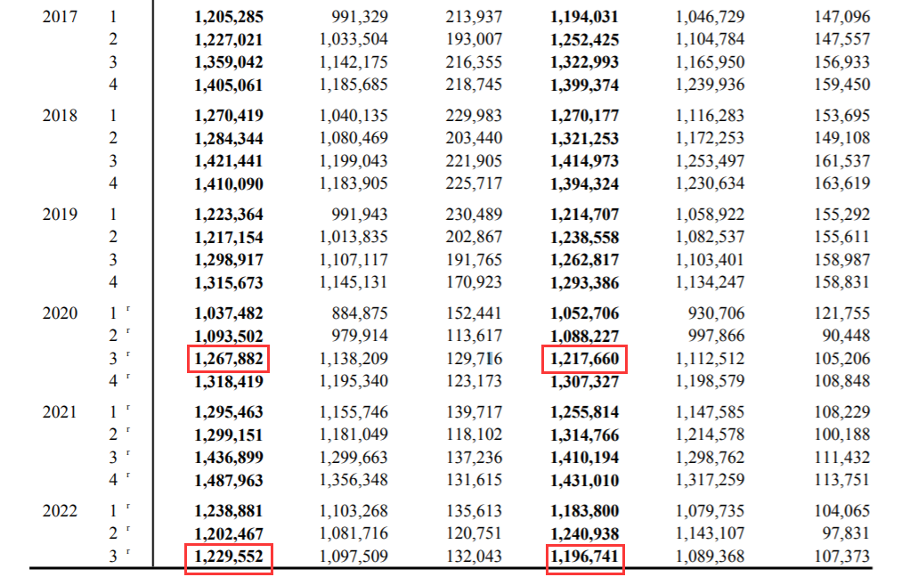 香港GDP第三季季刊显示,二季度、三季度货品出口与服务输出(以2020年环比物量计算)分别是12024.67亿元、12295.52亿元。货品进口与服务输入分别是12409.38亿元、11967.41亿元。从第三季度表现看来,现下进出口贸易甚至差于2020年疫情刚爆发时的同期。