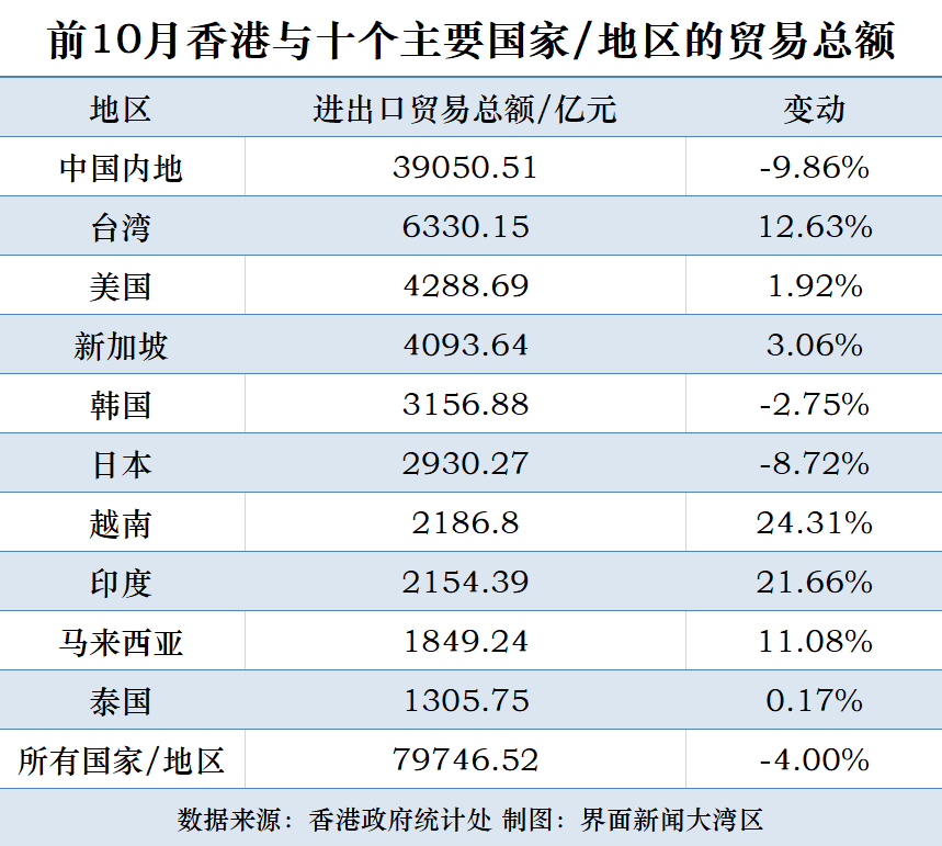 10月,香港面向内地的货物出口额和进口额分别下跌12.9%和18.3%;前10月,内地贸易总额为39050.51亿元,跌幅9.86%。