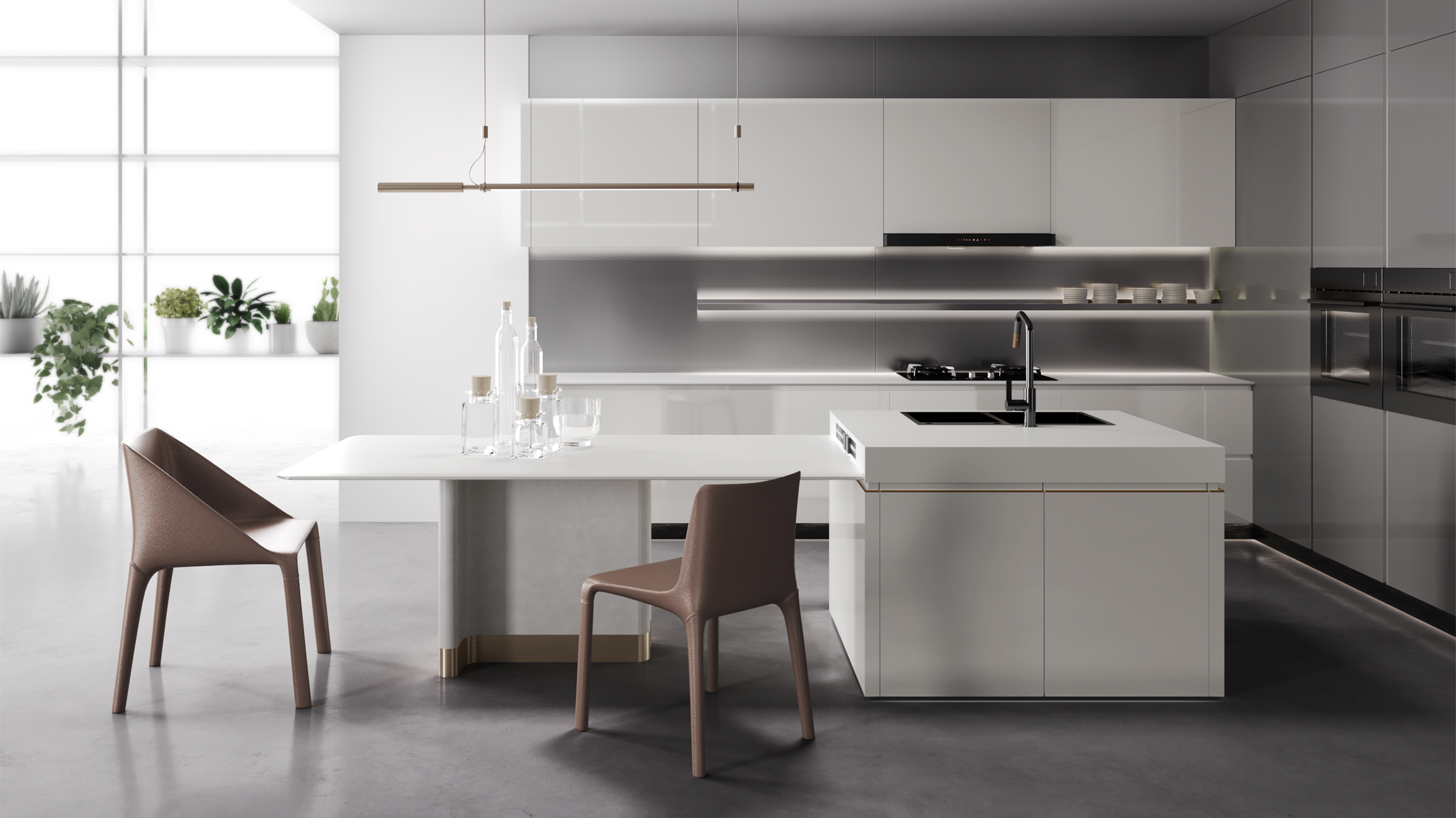 “铂菲”则通过智能工艺应用,采用隐藏式智能升降吊柜,提高吊柜使用空间率,并提高厨柜颜值。