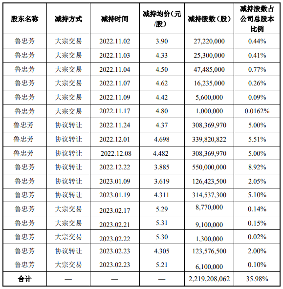 2月16日,因股票质押式回购交易违约,鲁忠芳将所持2.00%股权转让给侯泽培,价款5.32亿元,优先用于偿还股权质押协议项下的相关费用。