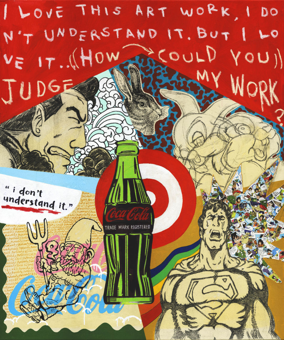 《I don't understand it》100x120cm Acrylic Paint, Oil Pastels, Oil Sticks, Charcoal, Graphite, Marker, Collage on canvas 2023