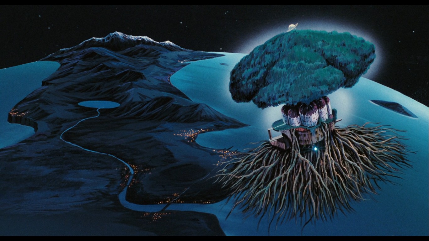 在宫崎骏的电影中,森林就是世界的化身,森林的状态好坏则体现出人类“自我内爆”的程度。《幽灵公主》的故事发生在处于转型期的农业社会,这时的人类刚刚开始掠夺自然资源,远古森林仍然是丰饶、充满活力且危险的地带,山犬、野猪与猩猩的族群站在各自的立场上、试图保护森林不受侵害。在《天空之城》中,拉普达是一个离开了地面的末日森林,宁静而寂寥,只有身上布满青苔的机器人和鱼鸟们在此生活,树底下矗立着悲凉的巨大墓碑。受破坏最严重的是《风之谷》的森林,在人类盲目扩张的工业文明之下,它们已经变成“腐海”,任凭有毒的孢子植物侵蚀着城市。