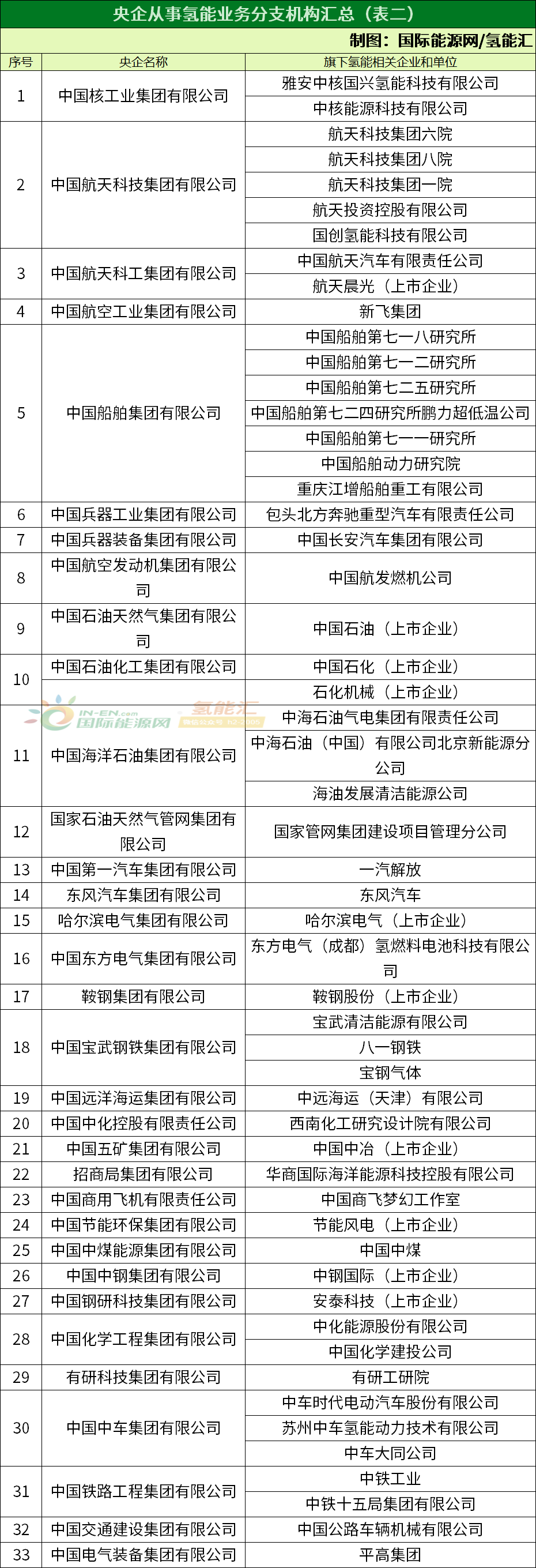 央企中除了能源电力企业,核工业、航天、船舶、兵器、石油化工、汽车、电气设备、钢铁、轨道交通等央企也都在氢能领域耕耘和开拓,尤其是中国航天科技集团、中国船舶集团和中国石油化工集团,三个大集团内部有大量氢能企业,在制氢、储氢、输氢、用氢场景做出了大量开拓性创新工作。