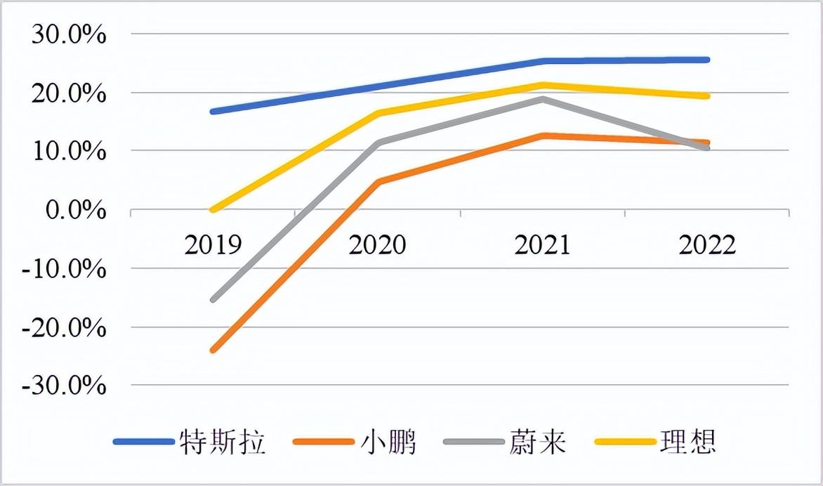图2:特斯拉、小鹏、蔚来、理想整体毛利率变化走势图,资料来源:穆胜咨询、特斯拉、小鹏、蔚来、理想财报