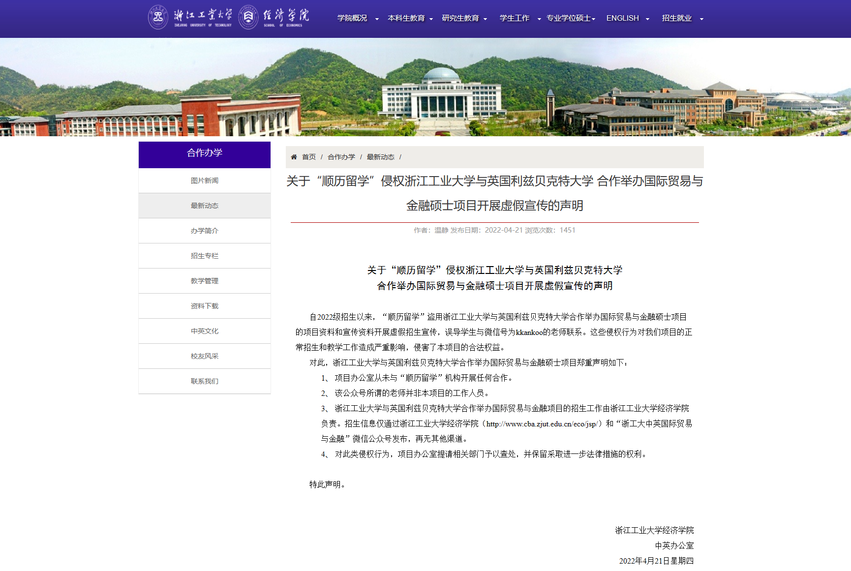 2022年4月,浙江工业大学经济学院中英办公室发布声明称,自2022级招生以来,“顺历留学”盗用浙江工业大学与英国利兹贝克特大学合作举办国际贸易与金融硕士项目的项目资料和宣传资料,开展虚假招生宣传。